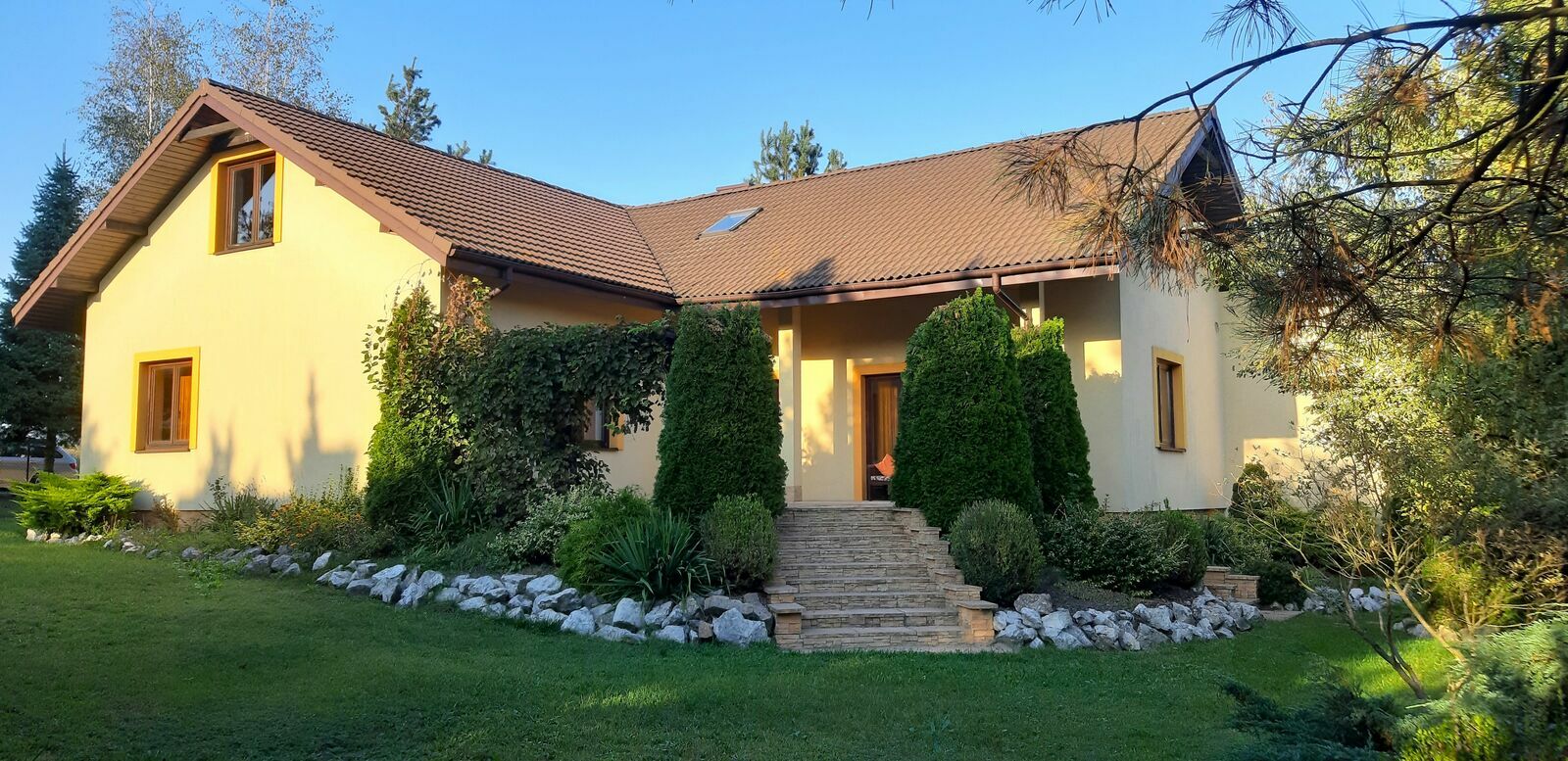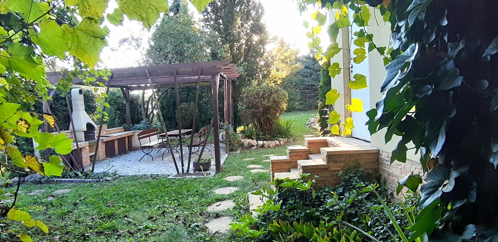 Bardzo ładnie zagospodarowana jest działka (m.in. pergola z murowanym grillem, studnia).